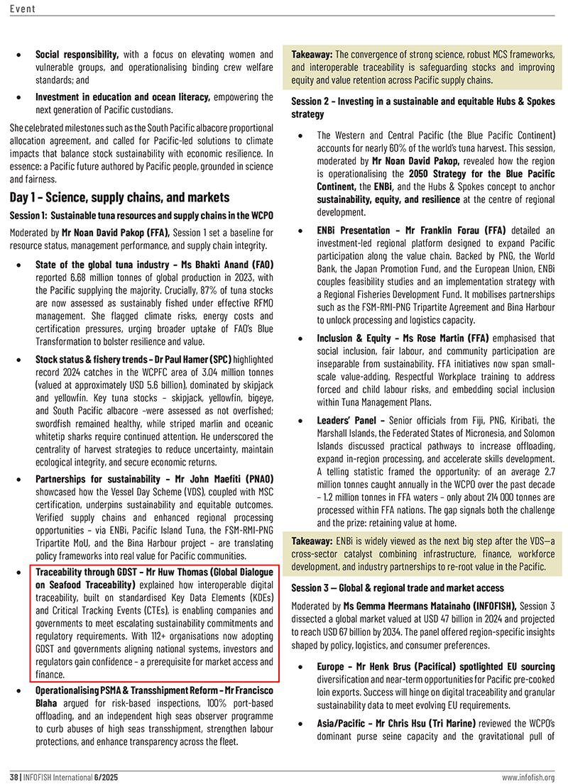 At the recent Infofish Pacific Tuna Forum 2025 our Executive Director Huw Thomas explained how interoperable digital traceability, built on standardized Key Data Elements and Critical Tracking Events, is enabling companies and governments to meet escalating sustainability commitments and regulatory requirements.